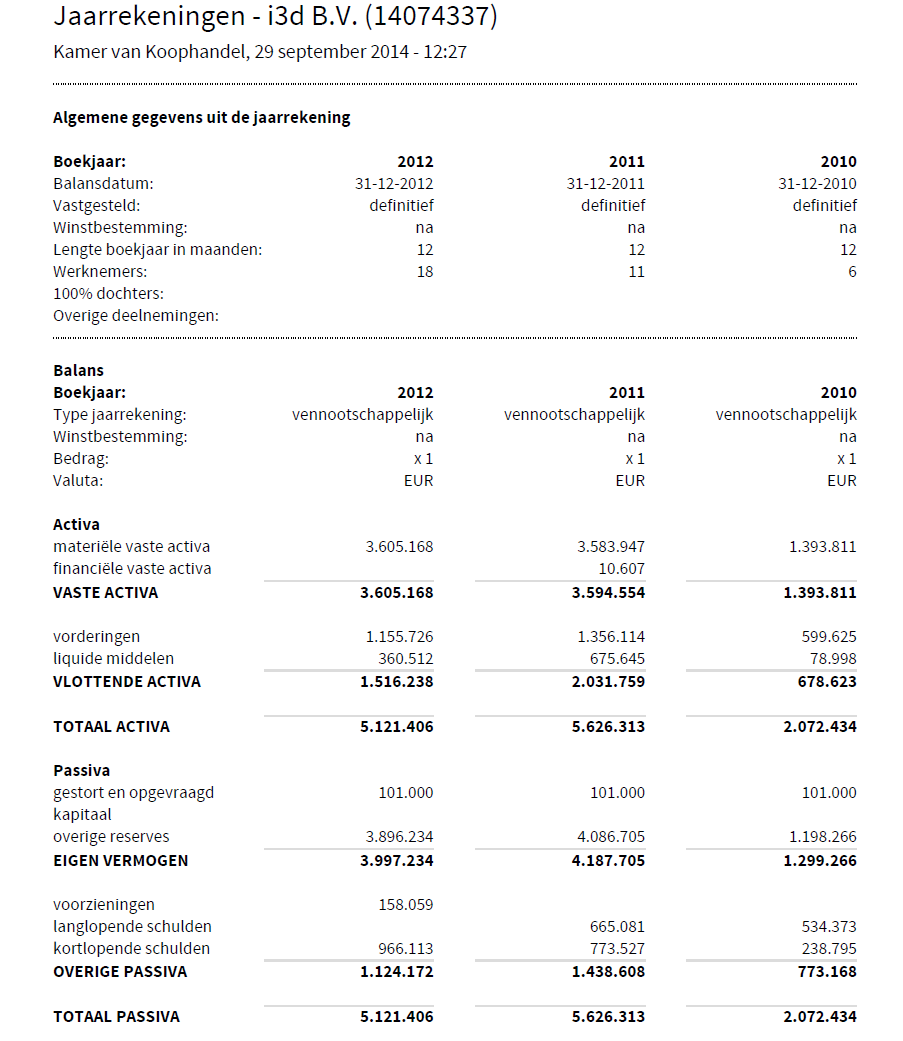 Daarin is de algemene reserve toegenomen van 3,8 miljoen naar 8,1 miljoen. Aannemelijk is dus dat de reserve van 2011 volledig is uitgekeerd aan de holding en de 3,8 miljoen overige reserve in 2012, in i3d BV voltallige winst is.