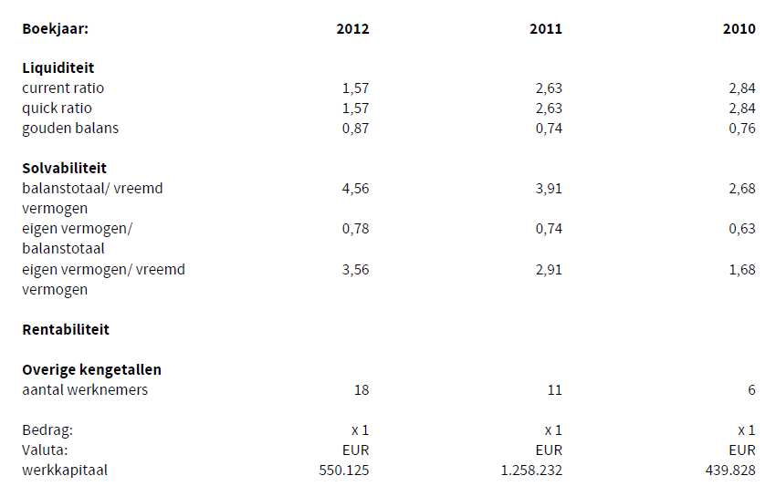Als we naar 2012 kijken, zien we een daling van de overige reserves van 200.000 euro. Dit zou dan weer kunnen duiden op een verlies in 2013. Een andere optie is dat er dividend is uitgekeerd aan de holding. De liquide middelen zijn teruggegaan van 675.000 euro in 2011 naar 360.000 euro in 2011, maar ook dit biedt geen uitsluitsel. Wanneer er namelijk dividend is uitgekeerd, gaan juist de liquide middelen omlaag.