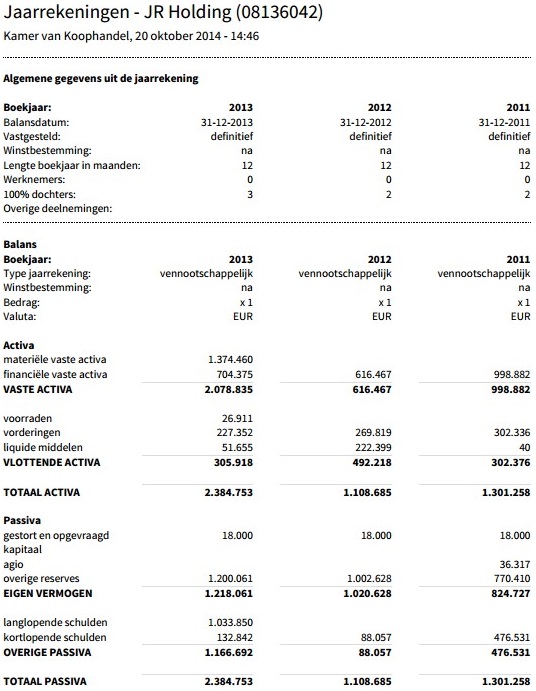 Als we kijken naar de balans van JR Holding B.V., dan zijn daar een aantal zeer opvallende dingen in te zien. Zo is daar als eerste de daling van de financiële vaste active met bijna vier ton in 2012. Dit betekent dat het eigen vermogen van de werkmaatschappijen in dat jaar met zo’n 400.000 euro is afgenomen. Dit betekent over het algemeen een van twee dingen: of er is een flink verlies gemaakt in 2012, of er is dividend uitgekeerd naar de holding. Het feit dat het vermogen van de holding zelf in 2012 wel stijgt, doet vermoeden dat hier sprake is geweest van dividenduitkering.