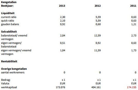 Als we verder kijken naar de balans 2013, dan zien we dat de financiële vaste activa met zo’n 90.000 euro toenemen en dat het vermogen van de holding met twee ton stijgt. De grote investering in het pand lijkt dus geen invloed te hebben gehad op de rentabiliteit van het bedrijf en zij hebben alsnog verdere groei weten te realiseren.