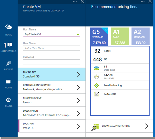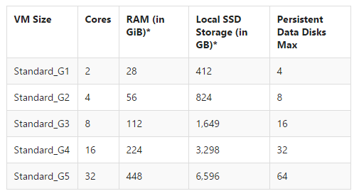 De kleinste virtual machine in de G-series (Standard_G1) heeft 2 vCPU-cores, 28GB RAM, 412GB SSD-storage. Bij elke grotere virtual machine versie in de G-series verdubbelen alle specificaties. Dus aantal CPU-cores, RAM-geheugen en SSD-storage. Op die manier zijn de specificaties van de grootste virtual machine, de Standard_G5, met 32 CPU-cores, 448GB RAM-geheugen en 6.596GB SSD-storage, 16 keer die van de Standard_G1.