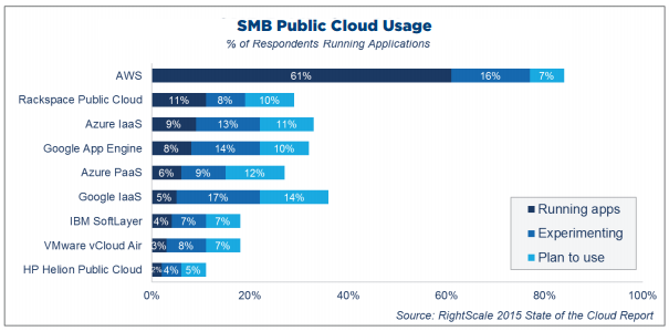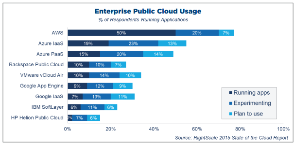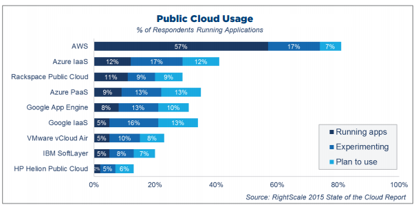 racksAmazon domineert de public cloud. Dat is niks nieuws, maar uit het RightScale 2015: State of the cloud report blijkt maar weer eens hoe groot Amazon AWS echt is. Het percentage bedrijven dat applicaties draait in de Amazon AWS cloud is namelijk net zo groot alsĀ het percentage bedrijven dat een applicatie heeft draaien in de public cloud van een andere aanbieder.