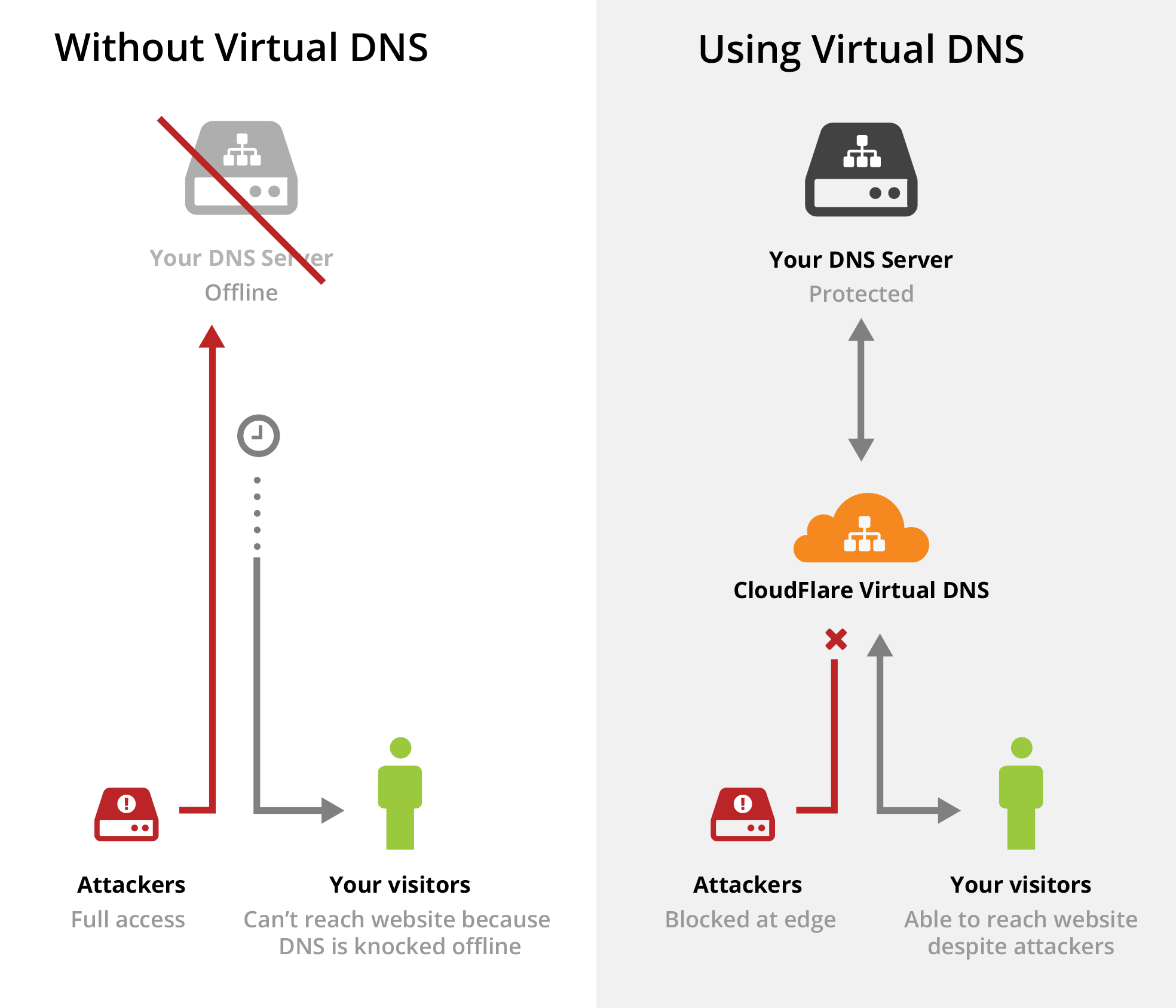 Cloudflare heeft afgelopen week een nieuwe dienst gelanceerd waarmee websites requests van hun DNS-servers nog sneller kunnen maken en kunnen beschermen tegen DDoS-aanvallen. Virtual DNS, zoals de nieuwe dienst heet, fungeert als een reversed proxy tussen de achterliggende nameservers van een domeinnaam en de rest van het internet.