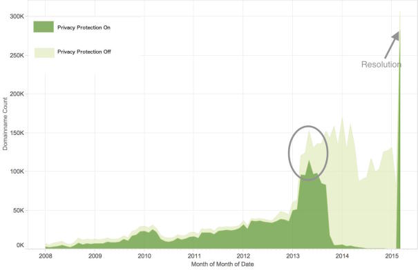 Aan privacy protection is duidelijk een sterke behoefte want maar liefst 94% van de klanten kiest daarvoor. Totaal gaat het om 282.867 domeinnamen waarvoor de privacy protection wordt aangezet. Talos ontdekte echter recent dat in 2013 het aantal domeinnamen waarbij privacy protection aan staat, sterk afneemt en uiteindelijk daalt tot minder dan 1% van alle geregistreerde domeinnamen.