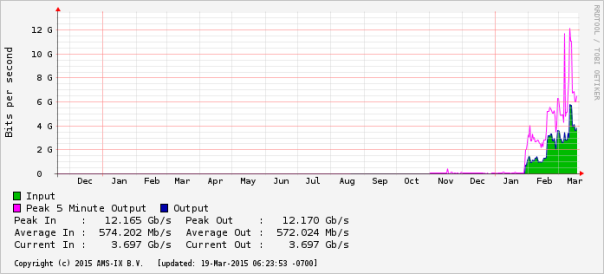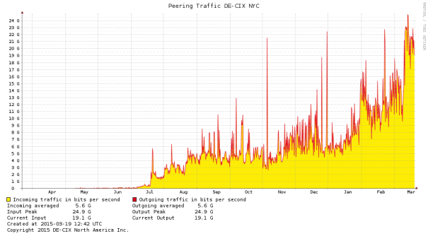 Vooral de DE-CIX New York is sinds juli vorig jaar bezig met een gestage groei van het uitgewisselde dataverkeer, van bijna niks groeide de hoeveelheid dataverkeer naar een piek van 24,9 Gbps. Ook AMS-IX Bayarea laat sinds februari dit jaar een groei zien. Eind vorig jaar was de hoeveelheid uitgewisseld dataverkeer nog verwaarloosbaar, deze maand piekte de internet exchange op 12,9 Gbps.