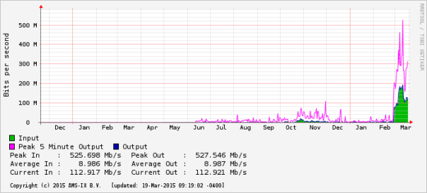 De groei van AMS-IX New York blijft echter achter. Sinds deze maand is er wel een relatief grote groei te zien van bijna géén uitgewisseld dataverkeer naar een piek van 527 Mbps maar de internet exchange blijft nog ver achter bij de concurrentie. LINX North Virginia heeft in een jaar tijd zelfs geen enkele groei laten zien. Vorig jaar was het de enige internet exchange met 1 Gbps uitgewisseld dataverkeer, vandaag de dag zit het nog op exact dezelfde hoeveelheid.