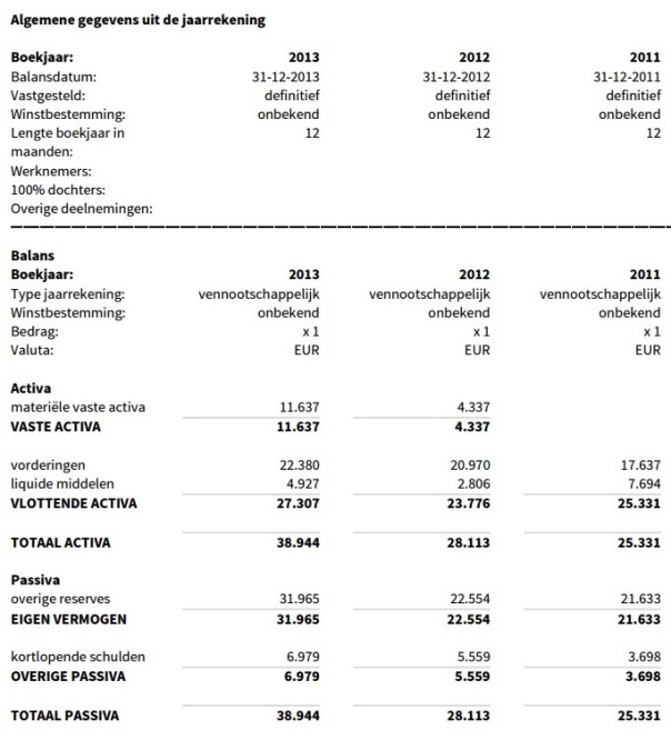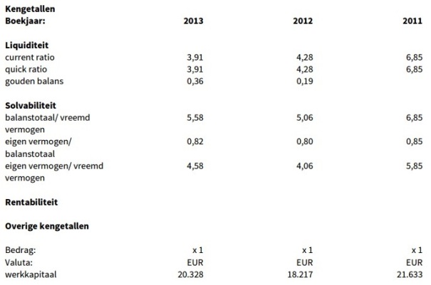 Dat er geïnvesteerd is uit eigen middelen kan ook de reden zijn voor de kleine stijging in het eigen vermogen. Ervan uitgaand dat de winst volledig wordt toegevoegd aan het eigen vermogen, zou er in 2012 nog geen duizend euro winst zijn gemaakt. In 2013 zou er dan weer groeiende winst zijn, aangezien het vermogen in dat jaar met ruim 9.000 euro stijgt. Sowieso is het netjes te noemen dat een klein bedrijf in de groei jaarlijks weet toe te voegen aan het vermogen.