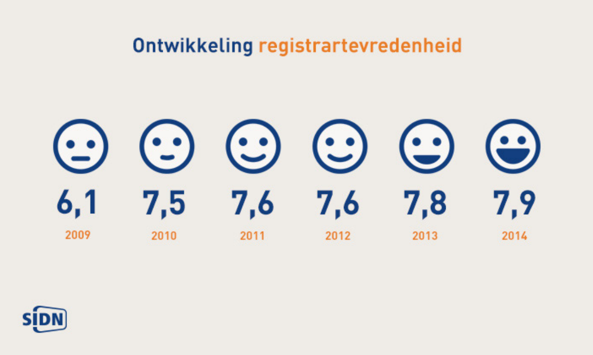 Een ding waar SIDN trots op is (en ook mag zijn) dat het opnieuw de hoogste registrartevredenheid ooit heeft behaald. In 2014 kreeg SIDN een 7,9 van de registrars. Ter vergelijking in 2009 was dat nog maar een magere 6,1.