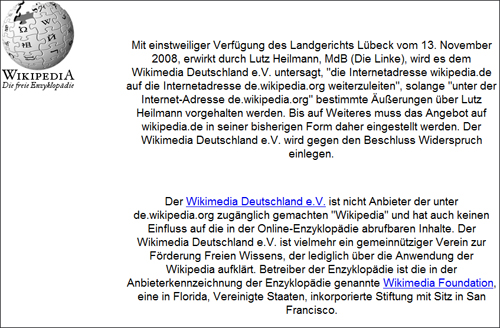 De Duitse parlementariër Lutz Heilmann heeft via een kort geding de Duitse tak van Wikipedia af laten sluiten. Dit deed hij omdat op zijn pagina berichten over zijn verleden stonden uit de Stasi en DDR-tijd die hij graag wou censureren verbergen. Omdat Heilmann het hier niet mee eens was, heeft hij de stap naar de rechter gemaakt. Opmerkelijk, omdat hij zelf de pagina aan zou kunnen passen of eerst contact had kunnen opnemen met een van de Wikipedia beheerders.