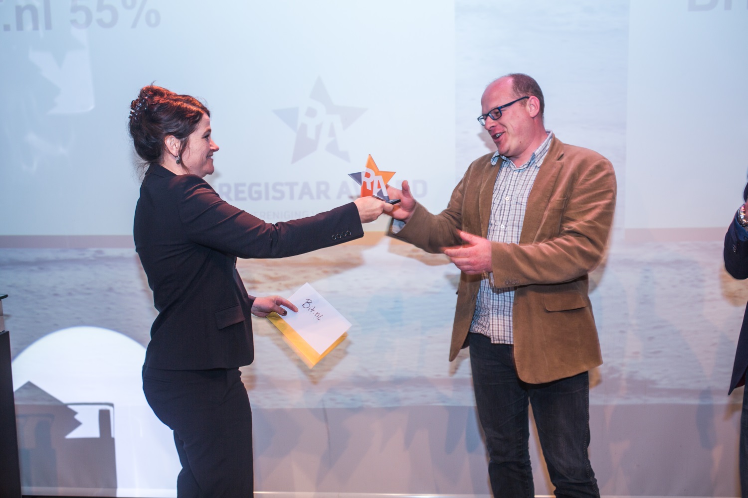 Margreth Verhulst, directeur van de Vereniging van Registrars, reikt de RegiStar Award uit aan Wido Potters van Bit in de categorie .nl registrar