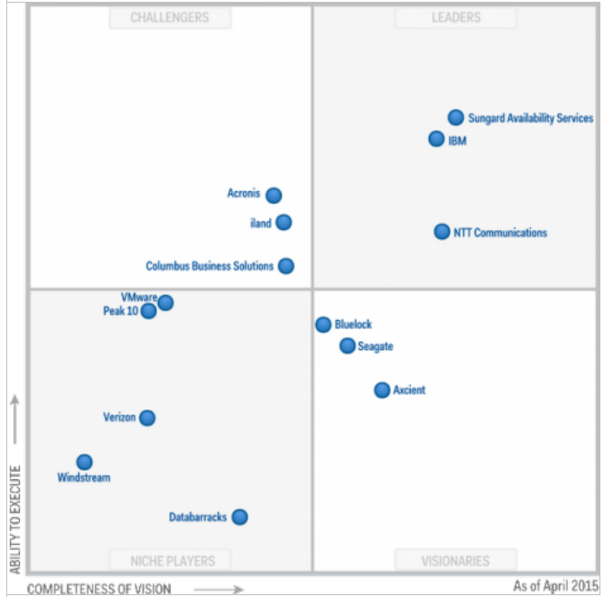 Enfin, het eerste kwadrant is een feit. Het zal vooral interessant zijn om te zien waar bedrijven als Bluelock en Seagate, de ‘visionairen’, hun toegevoegde waarde gaan leveren in DRaaS en backup-as-a-service. Bluelock levert Recovery as a Service en claimt honderd procent integratie in multi-tenancy. Seagate levert met EVault een recovery-service met een SLA waarbij een klant binnen één uur weer bij haar data kan. De voorbeelden geven aan dat DRaaS vooral nog zoekende is, zoekende naar wat de klant nu precies verwacht van een dergelijke service.