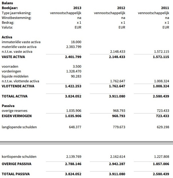 Het meest bijzondere op de balans zijn de n.t.t.w-posten in 2011 en 2012. N.t.t.w. activa betekent in de boekhouding niet of nog toe te wijzen activa. Dit zijn bijvoorbeeld vaste activa die (nog) niet zijn toe te wijzen aan een van de vaste categorieën immaterieel, materieel of financieel. In 2013 zien we deze posten worden onderverdeeld onder de vaste balanscategorieën. Waarom dit dan zo bijzonder is? Omdat het doorgaans zo is dat met name de Belastingdienst eist dat nog toe te wijzen posten vóór het inleveren van de jaarcijfers worden gecategoriseerd. Daarnaast blijkt uit de originele jaarrekening dat de posten, in ieder geval in 2012, wel al waren toegewezen. Mogelijk heeft men in de verkorte cijfers simpelweg zo min mogelijk financiële informatie willen prijsgeven.