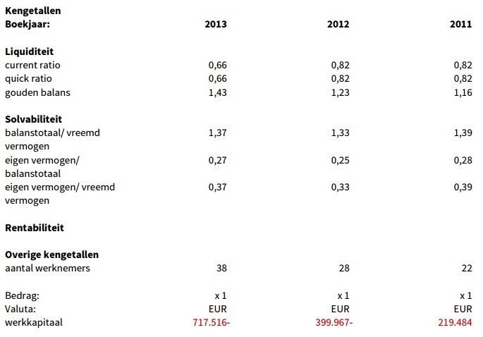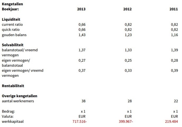 De current ratio, de verhouding tussen de kortlopende vorderingen en de kortlopende schulden, komt in 2013 uit op 0,66. Simpel gezegd betekent dit dat als het bedrijf al haar direct opeisbare schulden aflost met haar direct opeisbare vorderingen, zij bij de vorderingen en liquide middelen ruim zeven ton tekortkomt. Het werkkapitaal is in 2013 negatief. De uitkomst van -/- 717.516 euro betekent dat er ruim zeven ton tekort is als de kortlopende schulden en de kortlopende vorderingen tegen elkaar worden weggestreept.