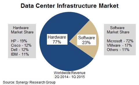 Microsoft is begin 2015 goed voor 72% van de software uitgaven in het datacenter. Het aandeel van Microsoft en VMware in de software is dermate groot (72% en 17%), dat het aandeel van de overige fabrikanten (11%) ogenschijnlijk in het niets valt.