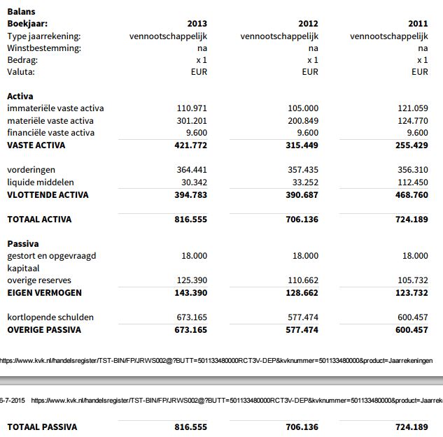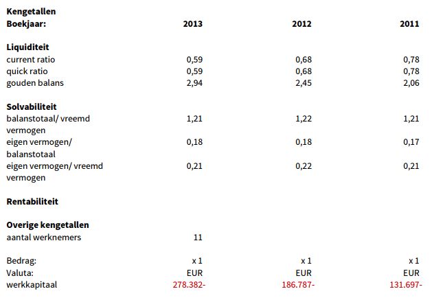 Als we aan de andere kant kijken naar het eigen vermogen, dan zien we een stijging van de reserves met ongeveer 5.000 euro in 2012 en zo’n 15.000 euro in 2013. Dit lijkt te duiden op een winstgevende bedrijfsvoering. Het lijkt geen dikke winsten te genereren, maar het blijft winst en ze lijken groter te worden. Let wel, het zou natuurlijk altijd nog kunnen dat er meer winst wordt gemaakt dan de cijfers doen vermoeden. Als er bijvoorbeeld jaarlijks dividend wordt uitgekeerd aan de aandeelhouder(s) ligt de winst een stuk hoger.