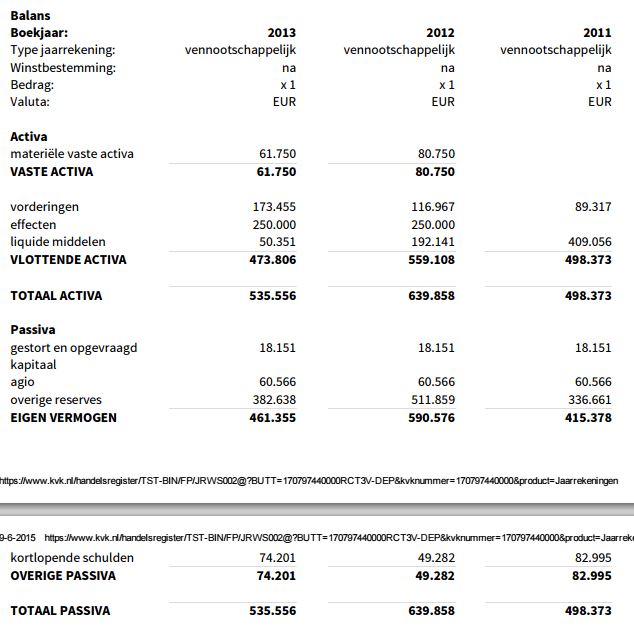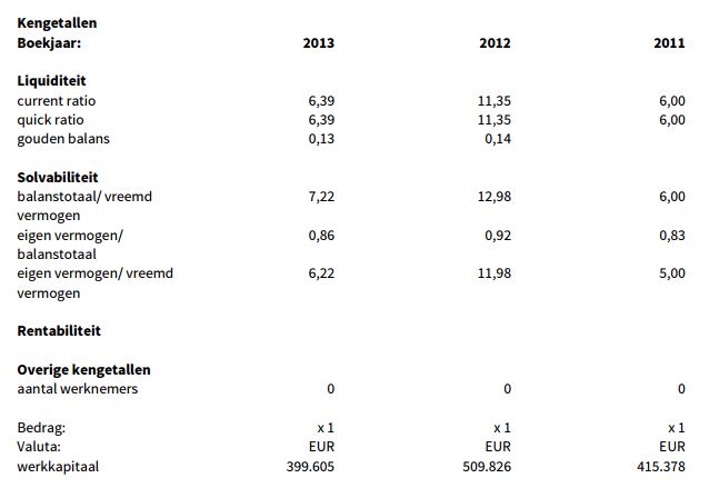 Naast het feit dat bijna geen schulden op de balans staan, is er ook voldoende eigen vermogen aanwezig. Wel nemen de overige reserves in 2013 met ruim 129.000 euro af. Dit zou kunnen betekenen dat er in 2013 voor bijna 130.000 euro verlies is gemaakt, maar het zou ook simpelweg kunnen zijn dat er voor een dergelijk bedrag aan dividend is uitgekeerd aan de aandeelhouders. Gelet op de toename van de reserves in 2012, een stijging van ruim 175.000 euro, lijkt de laatste verklaring het meest voor de hand liggend.