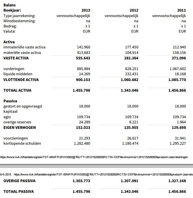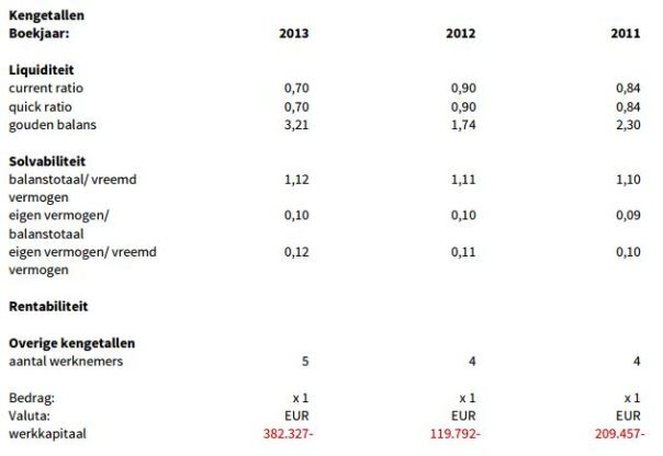 Aan de passivazijde zien we een bescheiden toename in de overige reserves. Dit betekent naar alle waarschijnlijkheid dat er winst wordt gemaakt, zij het een bescheiden winst. Er van uitgaand dat er in 2013 geen dividend is uitgekeerd, is er in dat jaar zo’n 16.000 euro winst gemaakt. Wat ook erg opvalt is de grote post kortlopende schulden. Deze is in alle drie de bekeken jaren ruim een miljoen euro, met een waarde in 2013 van bijna 1,3 miljoen. Dit zal ongetwijfeld te maken hebben met de zichtbare investering in vaste activa in 2013, maar het lijkt erop dat deze post wel aan de hoge kant is met 88% van het balanstotaal.