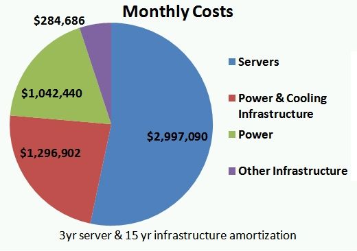 Hamilton heeft de kostprijs van servers, stroom en koeling infrastructuur, stroomverbruik en overige infrastructuur omgerekend van 15 jaar voor de infrastructuur en 3 jaar voor servers, naar een kostprijs per maand en daaruit blijkt dat niet de kostprijs van het stroomverbruik, maar de servers het hoogst is. Ook al is er op de berekening en de gekozen vaste waarden, zoals servers die $2.000 kosten en $0.07 per Kwh voor stroomverbruik voldoende af te dingen, het levert wel een frisse kijk op kostprijs berekening van datacentra. Hamilton heeft daarom ook de spreadsheet waarmee hij de berekening heeft gemaakt online gezet, zodat iedereen zijn eigen berekeningen kan maken. Lees verder bij O’Reilly en Data Center Knowledge.