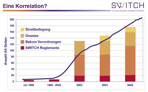 Wat betreft het aantal regels en het aantal geregistreerde domeinnamen ziet Urs Eppenberger een duidelijke correlatie, die goed terug te zien is in de volgende grafiek die het aantal A4tjes regels en het aantal geregistreerde .ch-domeinnamen weergeeft.