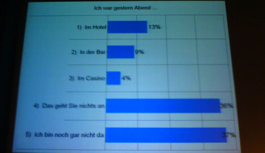 Door debat moderator Matthias Zehnder werd eerst een klein onderzoekje gedaan naar wie waar gisteren was, met behulp van de stemkastjes die op elke tafel lagen. Om te bewijzen dat Duitsers toch wel enige humor hebben, hier de uitslag van die Poll: