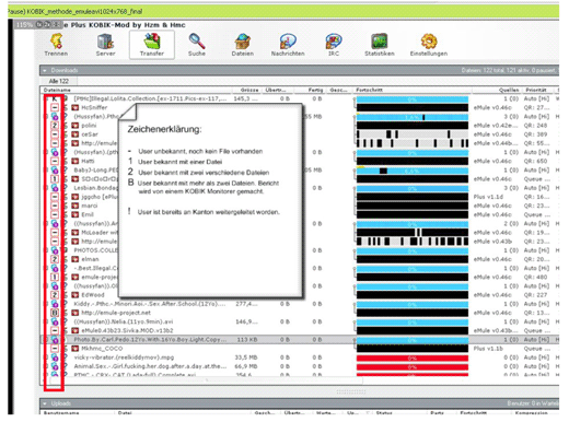 Wat betreft het zelf actief monitoren van internet ligt het zwaartepunt voor FEDPOL bij kindermisbruik en daarmee het bestrijden van kinderporno, 75 procent van de kinderporno dossiers komen tot stand door zelf actief te monitoren. Een van die manieren is door zelf actief peer to peer netwerken af te struinen opzoek naar aanbod. In de presentatie is een afbeelding te zien van de aangepaste eMule client die ze gebruiken, die dan zelfstandig illegaal aanbod detecteert en ook aangeeft of er over de aanbieder al een dossier is aangelegd. Van structurele aanbieders wordt een dossier aangelegd en daar volgt in 85 procent van de gevallen ook daadwerkelijk een veroordeling uit!