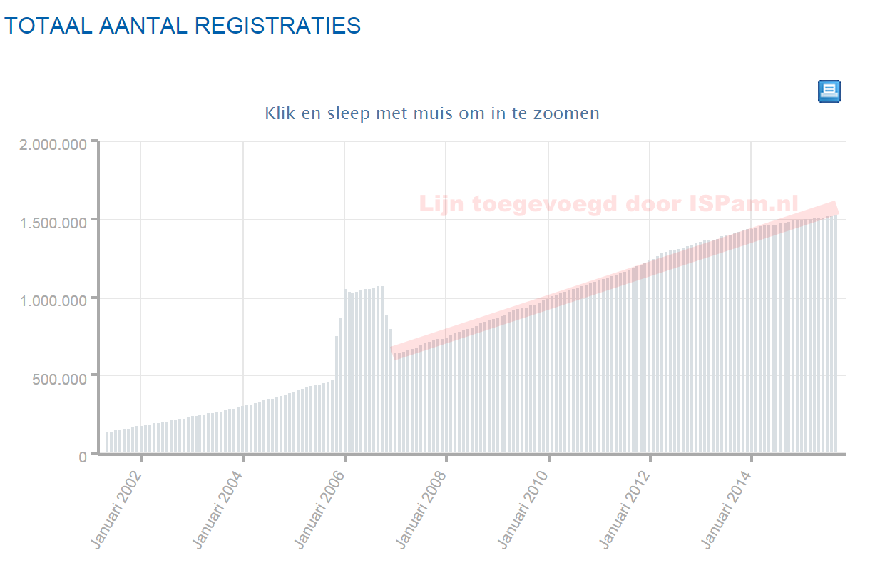 Het is dan op zijn zachtst gezegd opvallend dat DNS Belgium amper twee maanden later aankondigt de prijzen met maar liefst 33% te verhogen van 3 naar 4 euro per domeinnaam. Ook is er absoluut geen sprake van een (plotselinge) stagnatie in de groei van het aantal .be-domeinnamen. In de onderstaande grafiek is duidelijk te zien dat er meer .be-domeinnamen dan ooit zijn en dat de groei nog steeds binnen de historische trend zit.