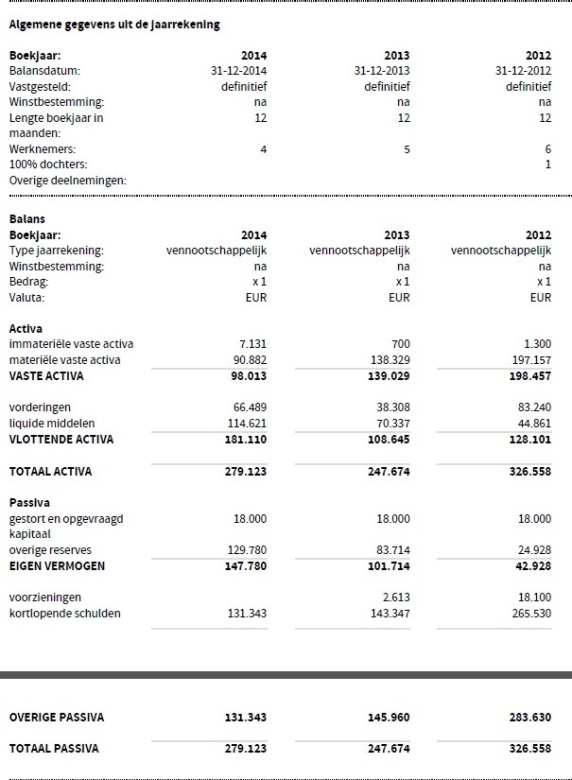 Dit laatste lijkt overigens het meest voor de hand liggend. Uit de algemene gegevens uit de jaarrekening blijkt namelijk dat Qweb in 2012 een 100%-dochter had, die in 2013 uit beeld verdwijnt. Ook loopt het aantal medewerkers in Qweb terug van 6 in 2012 naar 4 in 2014. Dit strookt niet met het beeld dat de rest van de balans geeft, namelijk een winstgevend bedrijf met voldoende liquide middelen.