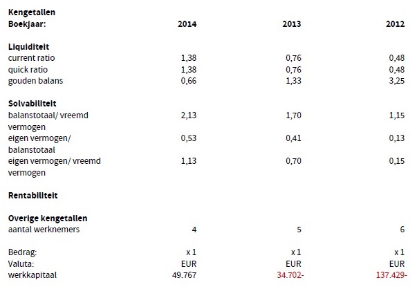 De current ratio, de verhouding tussen de kortlopende vorderingen en de kortlopende schulden, komt in 2014 uit op 1.38. Simpel gezegd betekent dit, dat als het bedrijf al haar direct opeisbare schulden aflost met haar direct opeisbare vorderingen, zij van de vorderingen bijna 40% overhoudt. Het werkkapitaal is in 2014 positief. De uitkomst van 49.767 euro betekent dat er bijna 50.000 euro overblijft als de kortlopende schulden en de kortlopende vorderingen met liquide middelen tegen elkaar worden weggestreept.