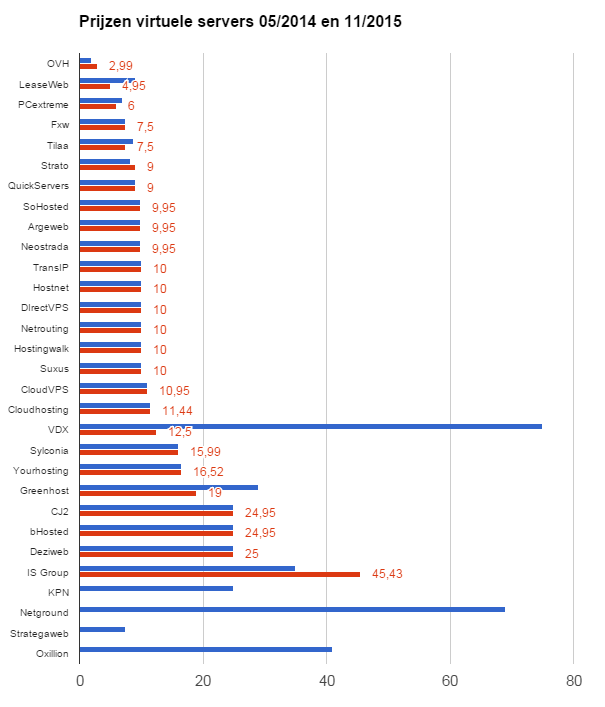 Alle prijzen van virtuele servers dit jaar en vorig jaar staan in de grafiek hieronder.