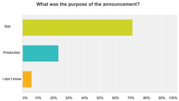 RIPE NCC kreeg totaal 69 reacties op hun enquête, zo schrijft de organisatie in een blogpost. De belangrijkste bevinding daaruit is dat 70% van de netwerken hun IPv6 announcement enkel gebruikte om te testen alvorens het daadwerkelijk in de productie-omgeving te gebruiken. Meer dan 20% gebruikte IPv6 wél al in hun productie-omgeving en een paar procent wist niet met welke reden IPv6 eerder aangezet was.