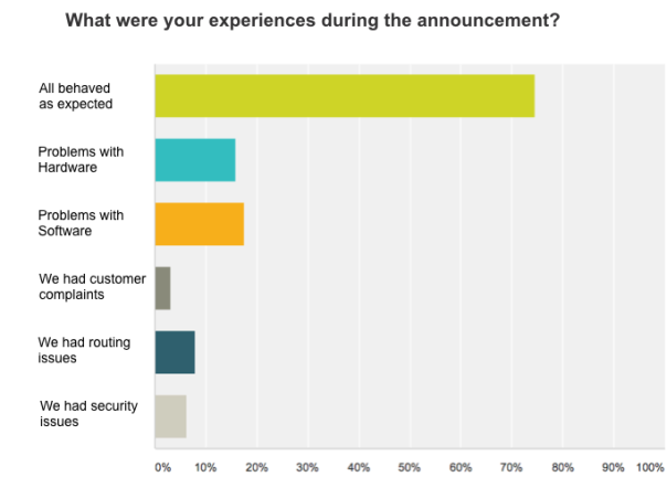 Een tweede interessante uitkomst is dat bij driekwart van de netwerken die is gestopt met het announcen van IPv6 prefixes, alles werkte zoals verwacht. De meeste problemen die netwerken ondervonden, hadden hadden te maken met software, op de voet gevolgd door hardwareproblemen, beide problemen werden door minder dan 20% van de contactpersonen genoemd. Veel minder kwamen routing en security-problemen voor, terwijl klachten van klanten bijna niet werd genoemd.