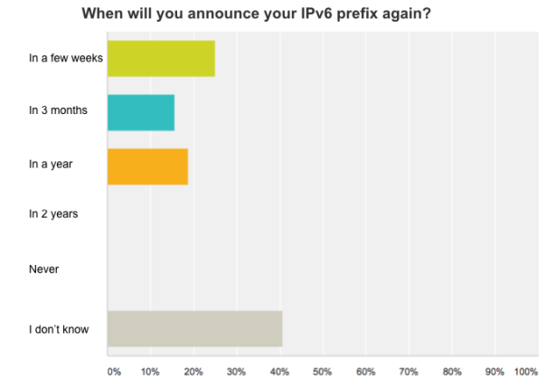 De laatste uitkomst uit de enquête is dat 60% van de netwerken verwacht binnen één jaar weer IPv6 te gaan announcen. Het grootste deel daarvan verwacht dat zelfs binnen enkele weken weer te zullen doen. Daar staat tegenover dat 40% van de netwerken nog geen (enkel) idee heeft wanneer IPv6 weer zal worden ingeschakeld.