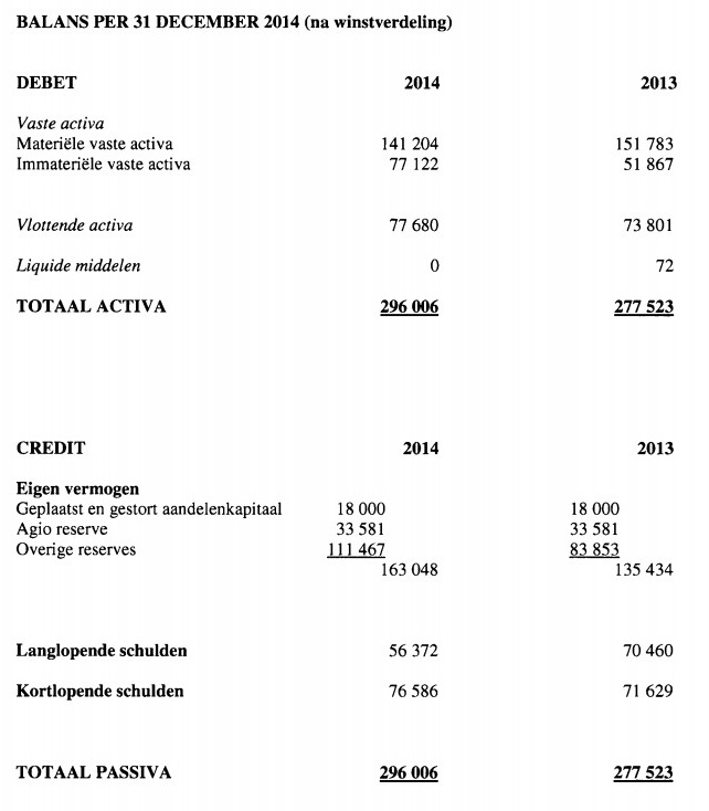 Aan de andere kant van de balans zien we eigenlijk gewoon een net draaiend bedrijf. Ook hier zien we geen hele grote cijfers, maar er is een prima eigen vermogen aanwezig, de langlopende schulden lopen netjes terug en de kortlopende schulden blijven op niveau. De reserves nemen met een kleine 30.000 euro toe, wat lijkt aan te geven dat er in 2014 zo’n 30.000 euro winst is gemaakt. Dit zou natuurlijk hoger kunnen liggen, maar dan is er dividend uitgekeerd aan de aandeelhouder(s).