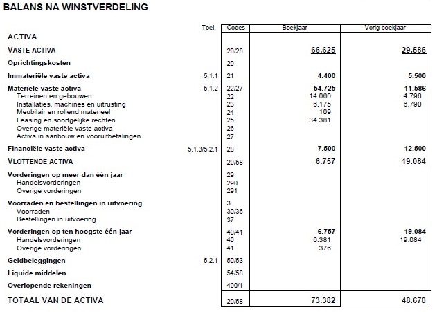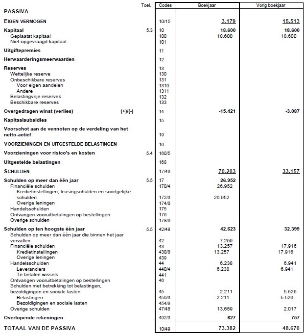 Als we de passivazijde bekijken zien we dat de schulden bijna nagenoeg evenveel toenemen als de activa. Dit doet vermoeden dat alle investeringen in het bedrijf zijn betaald met geleend geld, of in dit geval via een leaseconstructie. Ook zien we een daling van de reserves in de post ‘overgedragen winst’. De daling met ruim 12.000 euro lijkt aan te geven dat er in 2014 verlies is gemaakt.