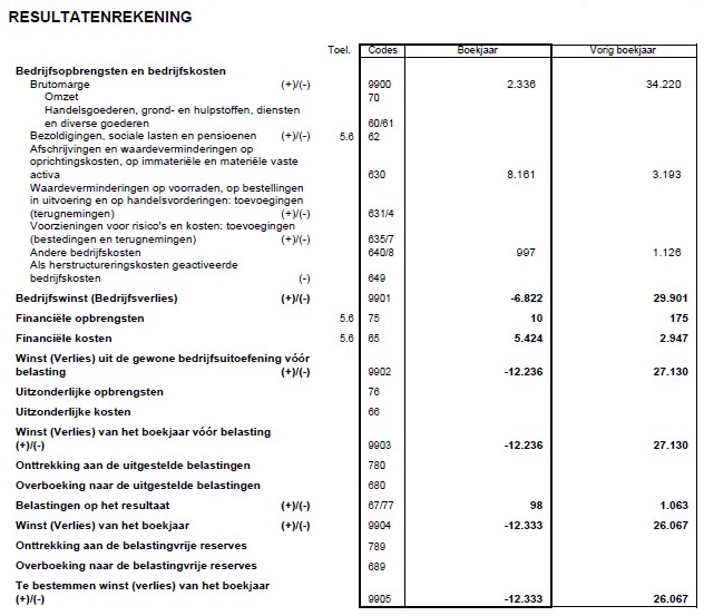 Aangezien in België gepubliceerd wordt mét verlies- en winstrekening, kunnen we dit vermoeden ook direct bevestigen. ABC Web heeft in 2014 inderdaad ruim 12.000 euro verlies gemaakt, waar in 2013 nog een winst werd gepresenteerd van ruim 26.000 euro. De belangrijkste boosdoener hiervoor lijkt de brutomarge te zijn, het verschil tussen de omzet en de direct aan de omzet te relateren kosten. Deze zakt namelijk in 2014 weg van 34.000 naar 2.000 euro.