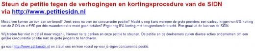 De initiatiefnemers van petitiesidn.nl hebben alle cat.1 deelnemers van de SIDN in een bulkmailing benaderd om steunverklaringen te winnen. Deze actie lijkt – zeker onder webhosters – om weinig sympathie te kunnen rekenen. Daarnaast is ook de petitie aangepast: De eerder genoemde punten zijn allen vervallen. Het enigste punt dat nu nog overeind staat is het terugdraaien van de kortingsregeling aan de grote deelnemers.