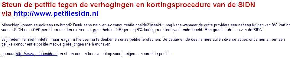 Veel providers vallen over de smakeloze manier waarop gepoogd wordt hen over te halen om de petitie te tekenen. Ook wordt een onjuist beeld geschetst van de situatie, door de zin “Maakt u nog kans wanneer de grote providers een cadeau krijgen van 8% korting van de SIDN en u € 50 per drie maanden extra moet gaan betalen?”. Dit is feitelijk onjuist. De kortingsregeling en de verhoogde kwartaalbijdrage zijn twee geheel los van elkaar staande dingen. Daarnaast geldt de 8% korting enkel over een kleine groep domeinnamen. Ook vergeet men te melden dat de transactiekosten van €0.52 voor onder meer nieuwe registraties komen te vervallen.