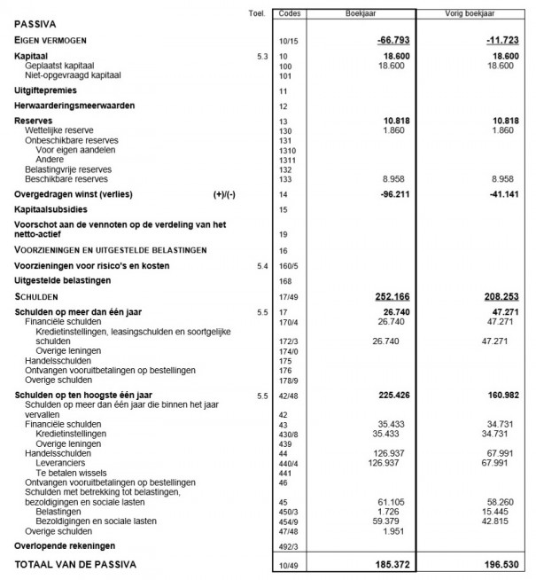 Als we dan naar de passivakant van de balans kijken, dan zien we echter dat het helaas in dit geval wel een negatief iets is. Bij het eigen vermogen zien we namelijk dat er in 2011 nog net een paar honderd euro winst werd gemaakt, maar dat vanaf 2012 er jaarlijks verlies is gerealiseerd. Erger nog, het verlies lijkt elk jaar groter te worden. Het bedrijf heeft sinds 2013 ook een negatief eigen vermogen. Dit betekent dat er meer schulden zijn dan bezittingen. De leveranciers lijken hierbij het meest van AlfaNet te vorderen te hebben.