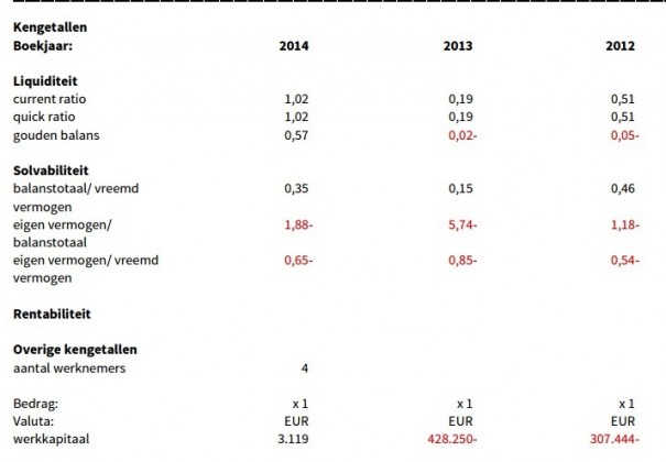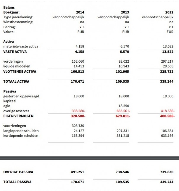 Wat aan de passivakant van de balans opvalt, zijn de overige reserves. Deze zijn in alle bekeken jaren behoorlijk negatief. Dit lijkt aan te geven dat er in het verleden verlies is gemaakt. In 2013 zien we de reserves teruglopen met 246.975 euro, wat een indicatie lijkt dat er bijna 2,5 ton verlies is gemaakt. In 2014 zien we de negatieve reserves weer verbeteren met ruim 3 ton, wat zou kunnen duiden op een flinke winst.