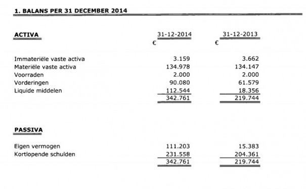 Een goede combinatie is verder de toename van zowel het eigen vermogen als de liquide middelen, beide rond de 90.000 euro. In het licht van de economische levenswijsheid ‘profit is an opinion, cash is a fact’ betekent dit dat de ogenschijnlijk gemaakte winst in 2014 ook daadwerkelijk voor een vollere portemonnee heeft gezorgd. Het enige dat een heel klein beetje zorgen baart, is de post kortlopende schulden. Niet dat de stijging in 2014 exorbitant groot is, maar de totale post neemt in verhouding wel een heel groot deel van de balans in beslag.