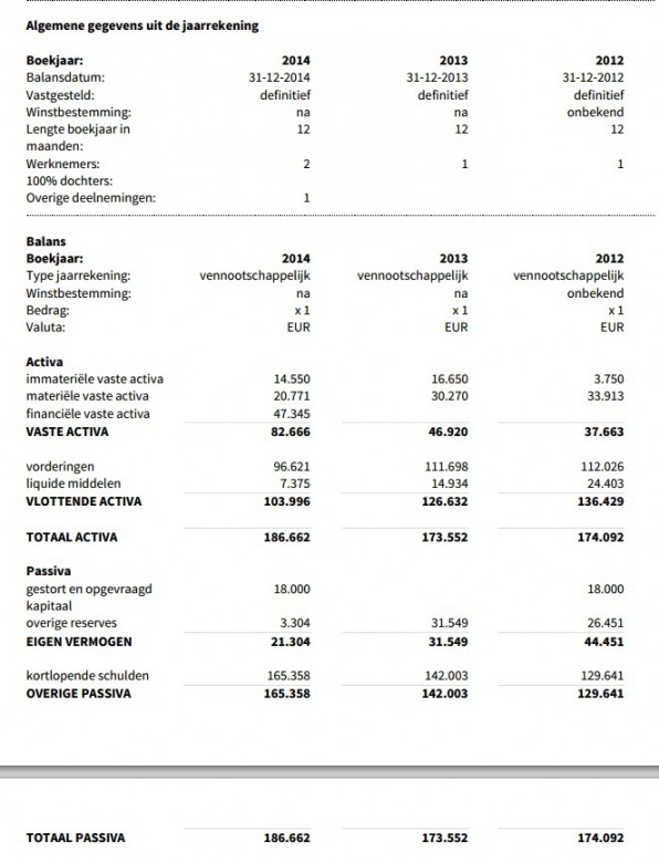 Als we dan naar de algemene gegevens kijken, zien we iets voorbij komen dat een heel ander licht op de cijfers lijkt te werpen. In 2014 zien we namelijk een deelneming ontstaan. Geen 100%-dochter, maar een ‘overige deelneming’. Met de bovenstaande signalen zou dit kunnen betekenen, dat er zich een partner heeft aangeboden en dat er gezamenlijk een nieuwe werkmaatschappij is opgericht.