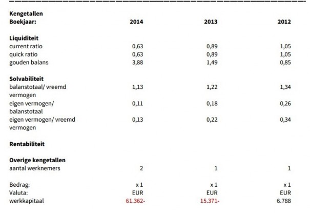 De ratio’s van SinnerG lijken op basis van de beschikbare cijfers matig. De current ratio, de verhouding tussen de kortlopende vorderingen en de kortlopende schulden, komt in 2014 uit op 0,63. Simpel gezegd betekent dit, dat als het bedrijf al haar direct opeisbare schulden aflost met haar direct opeisbare vorderingen, zij aan de vorderingen ongeveer een derde tekort komt. Het werkkapitaal is in 2014 negatief. De uitkomst van -/- 61.362 euro betekent dat er ruim 60.000 euro tekort is als de kortlopende schulden en de kortlopende vorderingen met liquide middelen tegen elkaar worden weggestreept.