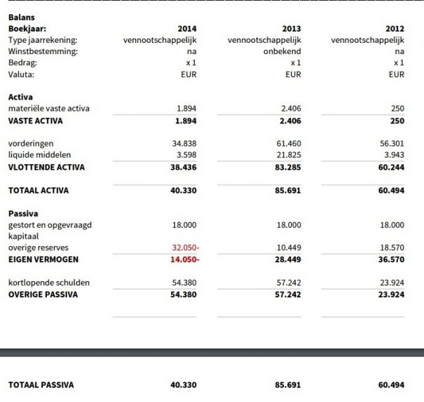 De balans lijkt ook aan te geven dat men in 2013 nog heeft geprobeerd een sprongetje te maken. We zien namelijk een lichte stijging in de vaste activa en een stijging van de vorderingen. Deze laatste is vaak een indicatie van toenemende omzet. Helaas lijkt deze mogelijke reddingspoging niet te zijn gelukt. We zien namelijk in 2013 de reserves met 8.000 euro teruglopen, wat lijkt te wijzen op een verliesjaar. Het jaar erop volgend zien we de activa weer teruglopen en de vorderingen zijn bijna gehalveerd. Dit is ook het jaar dat de reserves met ruim 42.000 euro teruglopen.