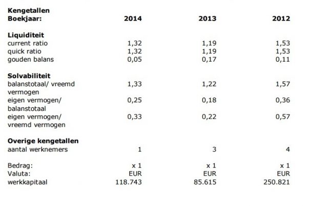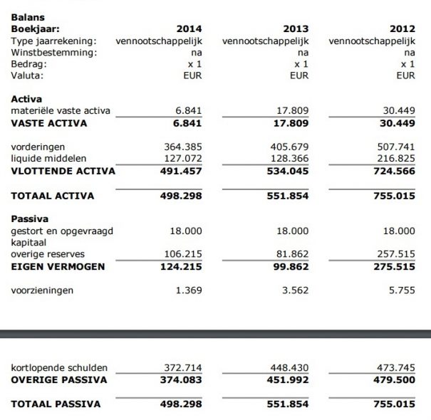 Aan de passivazijde van de balans zien we echter weer signalen die niet lijken te spreken van mindere tijden. Zo is er weliswaar een flinke daling van de reserves in 2013, wat mogelijk verlies van ruim 1,5 ton aanduidt, maar in 2014 nemen de reserves weer toe met ongeveer 25.000 euro. Er lijkt dus geen sprake van structureel verlies. Ook nemen de kortlopende schulden in alle drie jaren af, wat niet lijkt te duiden op een bedrijf in zwaar weer.