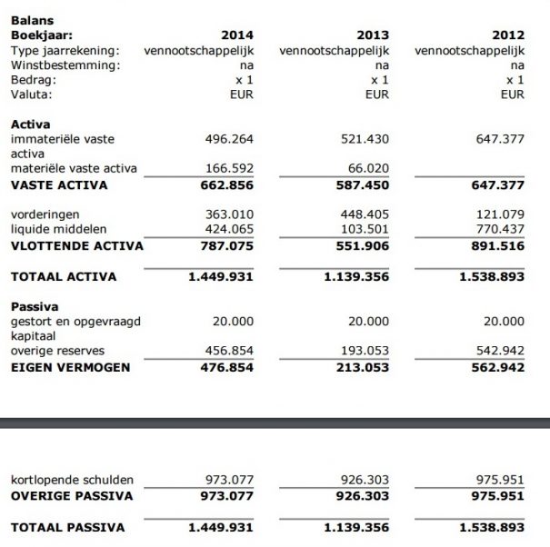 Er wordt volgens de balans ook goed geïnvesteerd in vaste activa. Deze nemen toe van nul in 2012, 66.000 in 2013 naar ruim 166.000 euro in 2014. Dat er in 2012 geen vaste activa op de balans staat hoeft overigens niet te betekenen dat zij geen zaken als servers en dergelijke in bezit hadden. Het meest voor de hand liggende lijkt te zijn dat Provider tot die tijd deze spullen via een operational lease-constructie had gefinancierd. Hierbij worden servers juridisch geen eigendom en komen daardoor niet op de balans.