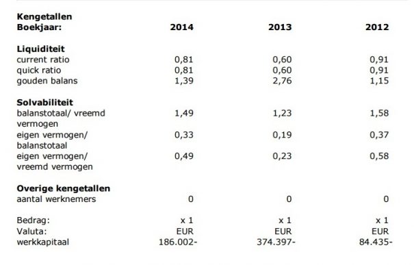 De ratio’s van Provider lijken op basis van de beschikbare cijfers matig. De current ratio, de verhouding tussen de kortlopende vorderingen en de kortlopende schulden, komt in 2014 uit op 0,81. Simpel gezegd betekent dit, dat als het bedrijf al haar direct opeisbare schulden aflost met haar direct opeisbare vorderingen, zij aan de vorderingen ongeveer een vijfde tekort komt. Het werkkapitaal is in 2014 negatief. De uitkomst van -186.002 euro betekent dat er bijna 2 ton tekort is als de kortlopende schulden en de kortlopende vorderingen met liquide middelen tegen elkaar worden weggestreept.