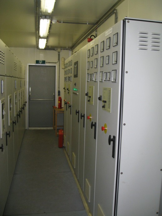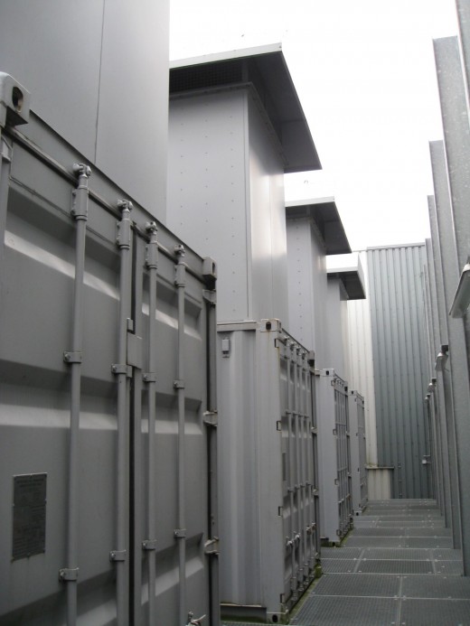 Na het gesprek kreeg ik een rondleiding door het nieuwe energy-center van Easynet. Dit is een aangebouwd deel aan het pand, dat bestaat uit een soort stalen-skelet, waar zeecontainers op staan, die alle technische infrastructuur bevatten. Zodra je de poort naar het energie-center door gaat komt je op de begane grond langs een batterij zeecontainers die de UPS-systemen van het datacentrum bevatten. In elke afzonderlijke zeecontainer zit het UPS-systeem zelf en de accu’s die voor noodstroom zorgen. Mocht de netspanning uitvallen dan kunnen de accu’s het datacentrum voor zo’n 15 minuten van stroom voorzien, zo legde Timmer uit.