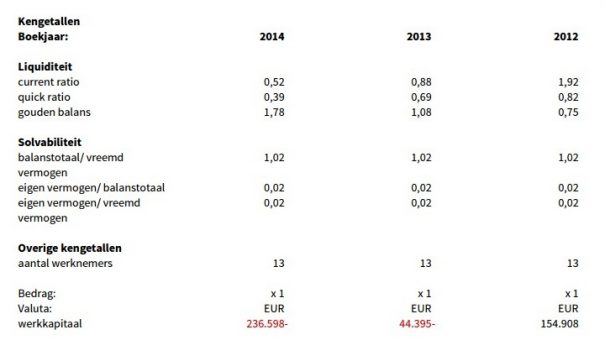 De current ratio, de verhouding tussen de kortlopende vorderingen en de kortlopende schulden, komt in 2014 uit op 0,52. Simpel gezegd betekent dit dat als het bedrijf al haar direct opeisbare schulden aflost met haar direct opeisbare vorderingen, zij aan de vorderingen de helft tekortkomt. Het werkkapitaal is in 2014 negatief. De uitkomst van -236.598 euro betekent dat er bijna 2,5 ton tekort is als de kortlopende schulden en de kortlopende vorderingen met liquide middelen tegen elkaar worden weggestreept.