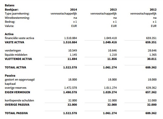 Een van de eerste dingen die duidelijk opvallen in de balans is een flinke groei. De financiële vaste activa nemen jaarlijks toe met zo’n 4-5 ton. Dit betekent dat het eigen vermogen van de werkmaatschappij(en) elk jaar met eenzelfde bedrag stijgen. Dit lijkt aan te geven dat er binnen de werkmaatschappij goede winsten worden gemaakt.