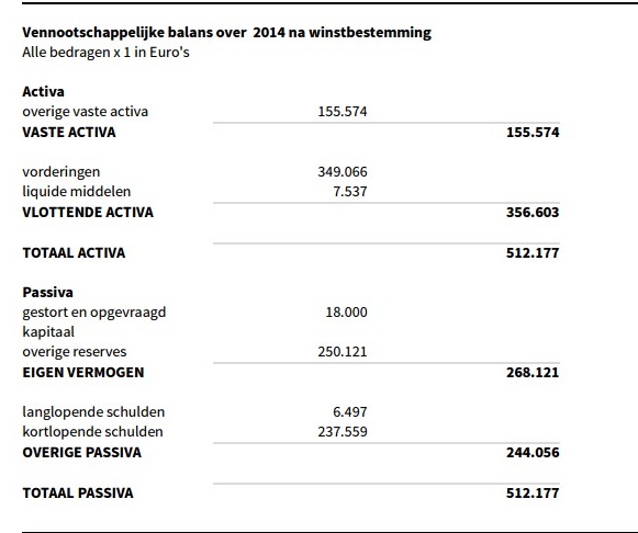 Als we naar de passivakant kijken zien we ook signalen die lijken aan te geven dat we bijna niet met een starter te maken kunnen hebben. Er is in 2014 namelijk al ruim 2,5 ton winst gemaakt. Verder zien we dat er geen noemenswaardige langlopende schulden aanwezig zijn. Er zijn dus naar het schijnt weinig externe partijen nodig om de activiteiten te kunnen uitvoeren.